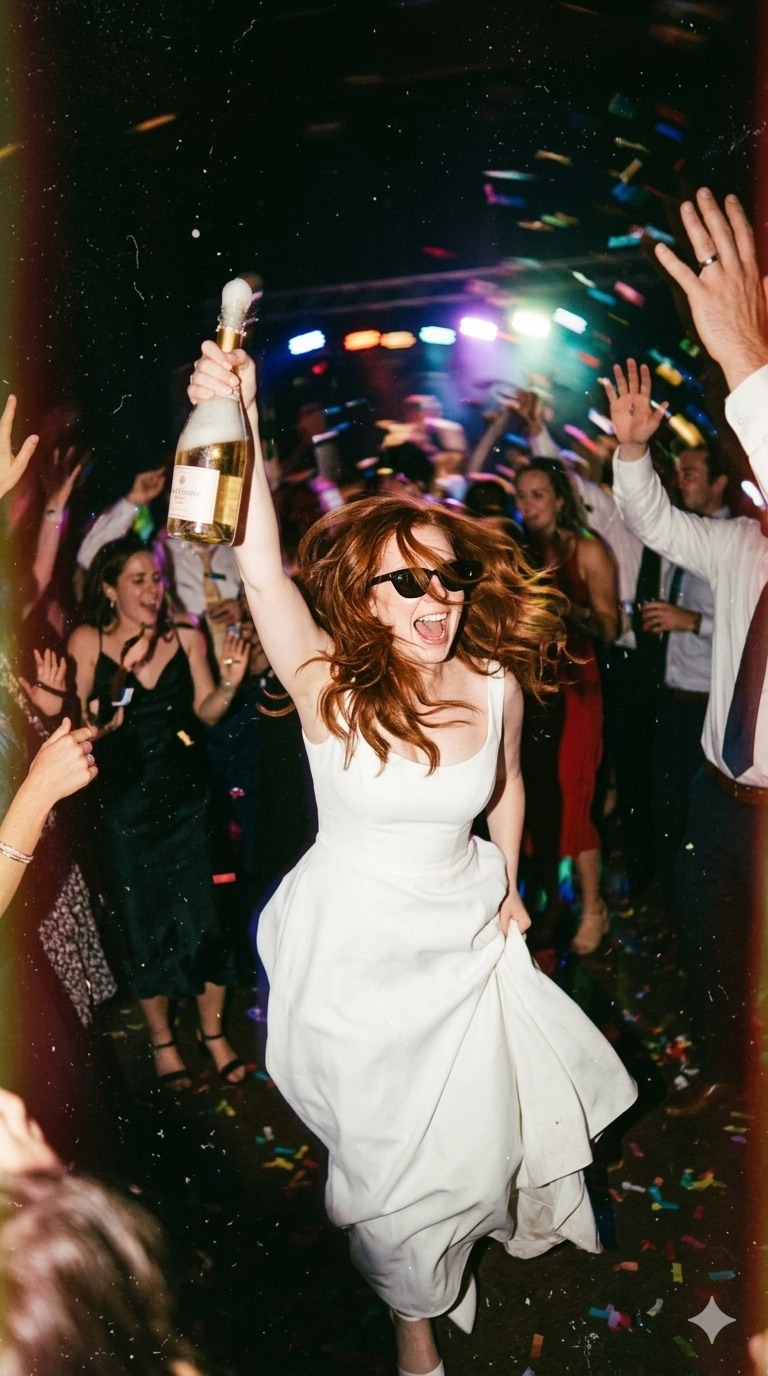 Этот кадр — чистый адреналин и эстетика пленочного репортажа. 📸 Весь секрет кроется в жесткой вспышке «в лоб» (direct flash) и смазанном движении. Мы не вылизываем картинку, мы добавляем в нее хаос: разлетевшиеся волосы, конфетти, блеск от софитов и легкую испарину на коже. Солнцезащитные очки в ночном клубе и минималистичное платье — это тот самый бунтарский вайб, который хочется немедленно сохранить в мудборд. 🪩 Учимся делать так, чтобы зритель слышал басы из колонок через экран.