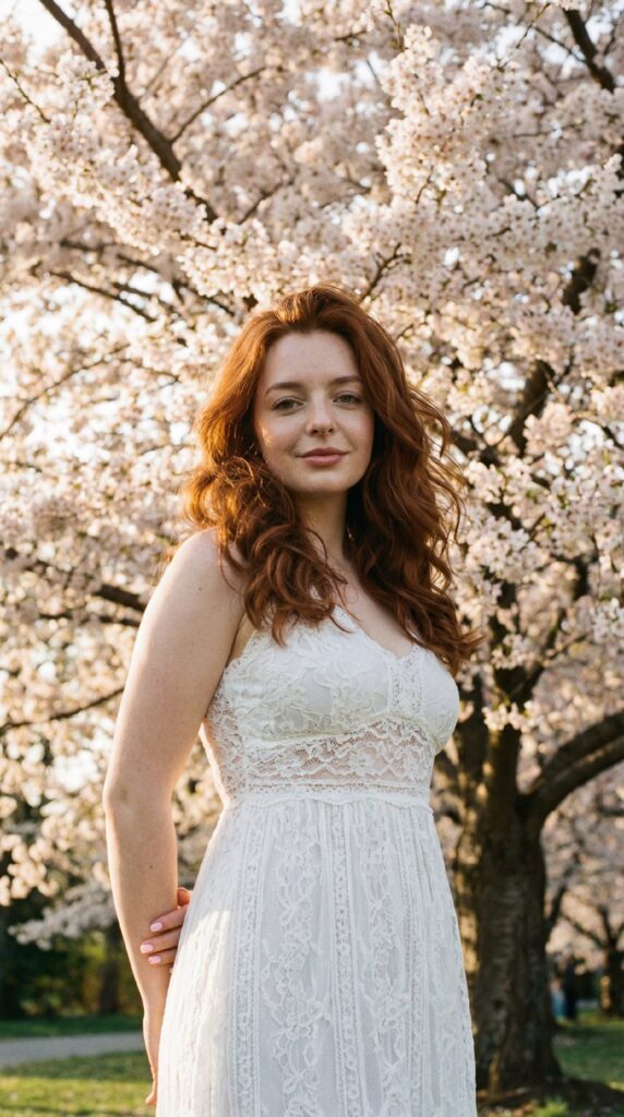 Только взгляните на эту роскошную детализацию. Тонкое белое кружево идеально подчеркивает красоту кожи 🕊️. Закатное солнце мягко подсвечивает пышные ветви сакуры. Теплый свет роскошно играет в рыжих волосах 🌿. Картинка получается невероятно глубокой и очень теплой.
