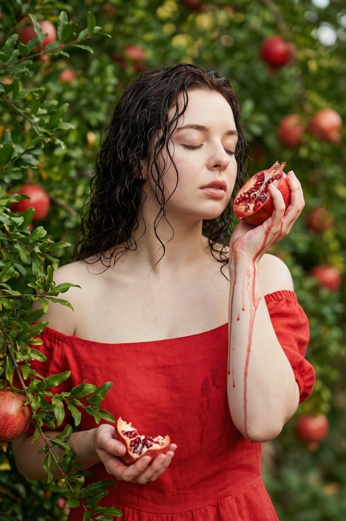Cinematic fashion editorial photography. Woman exactly matching the reference model, exact facial features, wet curly red hair. Standing in a green orchard, eyes closed peacefully, smelling a pomegranate half. Wearing a red off-the-shoulder linen midi dress. Red juice softly dripping down her arm, subtle natural makeup. Accurate human anatomy, flawless proportions, 5 fingers per hand. Soft diffused outdoor lighting, 8k. —ar 9:16
