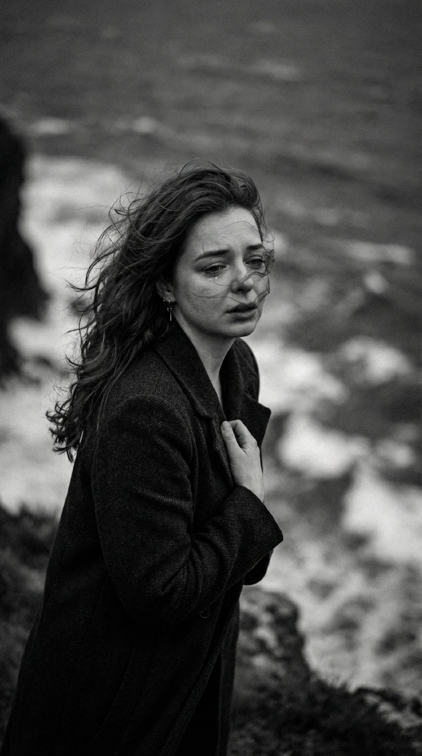 Стоять на краю обрыва всегда немного страшно. Она кутается в пальто, спасаясь от резкого ветра. Одинокая слеза застыла на ее бледной холодной щеке. Вся композиция кричит о поиске внутреннего покоя. Этот промпт создает идеальную атмосферу светлой грусти. Просто смотри и позволяй себе чувствовать эту боль.