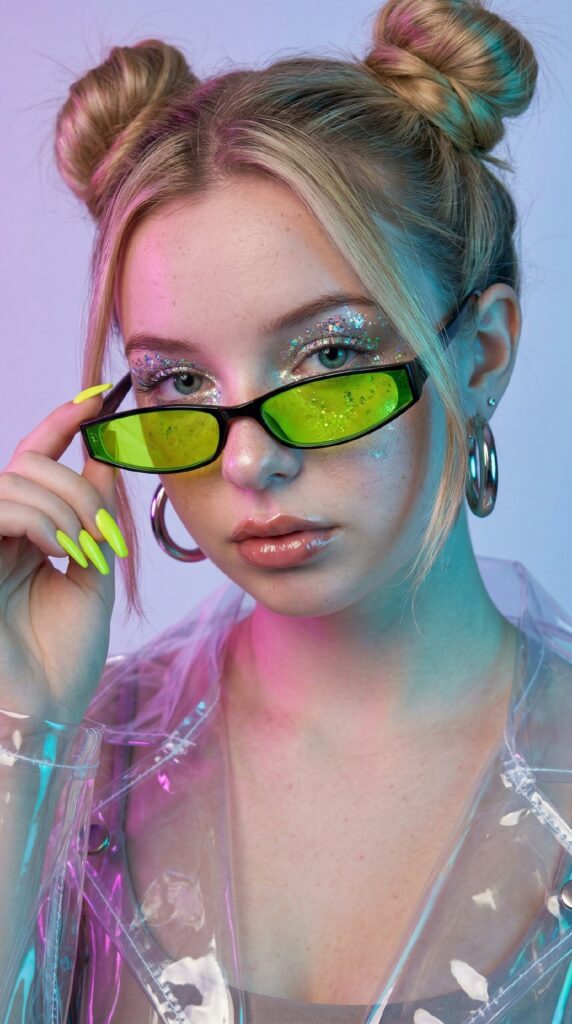 A highly realistic close-up beauty portrait of a teenage girl exactly matching the reference model, exact facial features. Acid Y2K aesthetic. Wearing narrow matrix-style neon green sunglasses, clear PVC jacket. Glossy overlined lips, heavy holographic face glitter, space buns hairstyle matching reference hair color, thick silver hoop earrings, long neon yellow manicure. Posing tilting head down looking over the glasses. Accurate human anatomy, flawless proportions. Intense studio neon lighting, 8k, photorealistic. —ar 9:16
