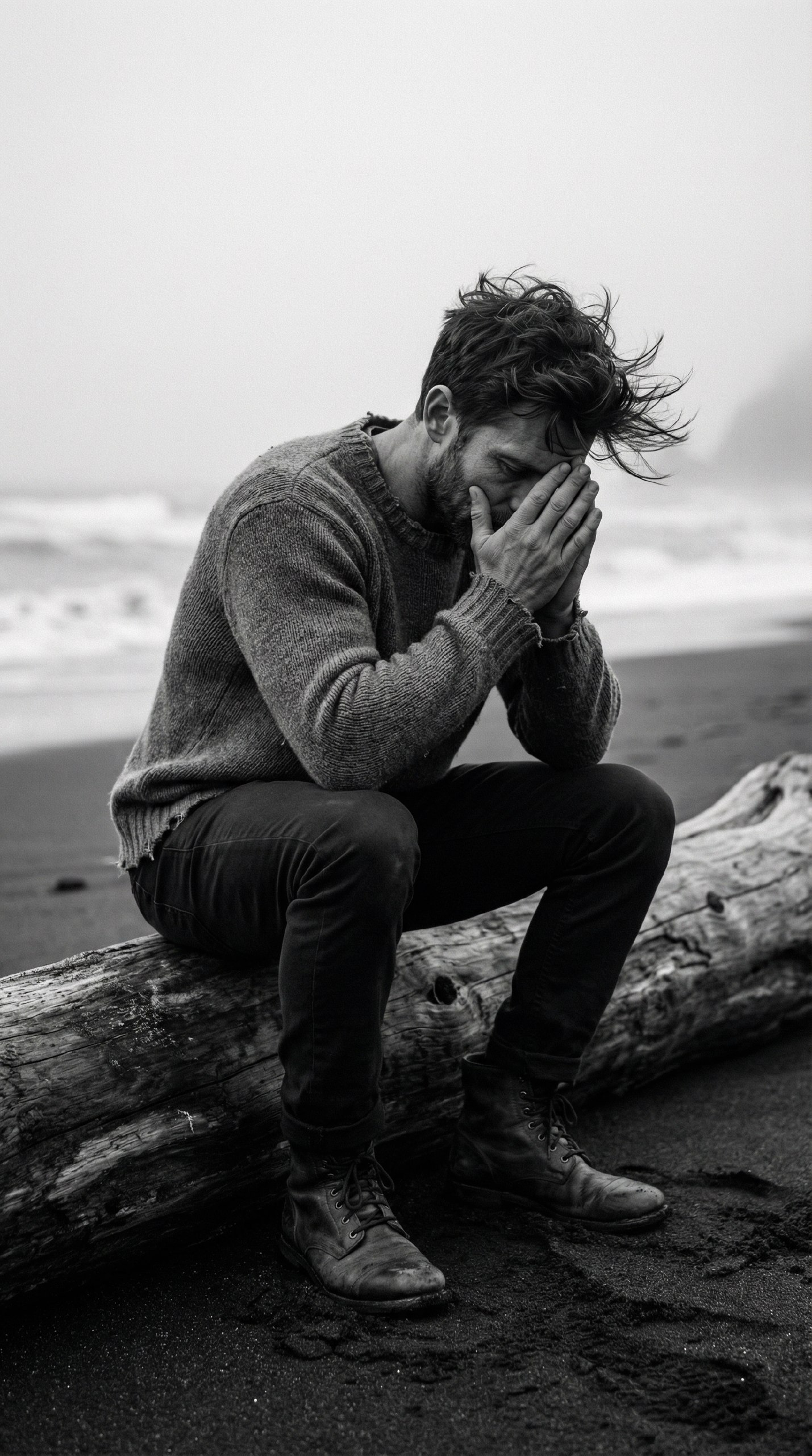 A highly realistic portrait of a man exactly matching the reference model, exact facial features. Raw emotional aesthetic, black and white photography. Sitting hunched on a piece of driftwood on a dark sandy beach. Hands covering his face in despair, windblown messy hair, heavy knit sweater, dark denim jeans, scuffed combat boots. Accurate human anatomy, 5 fingers, flawless proportions. Ocean waves crashing in the blurry background, cinematic misty lighting, 8k, photorealistic. —ar 9:16
