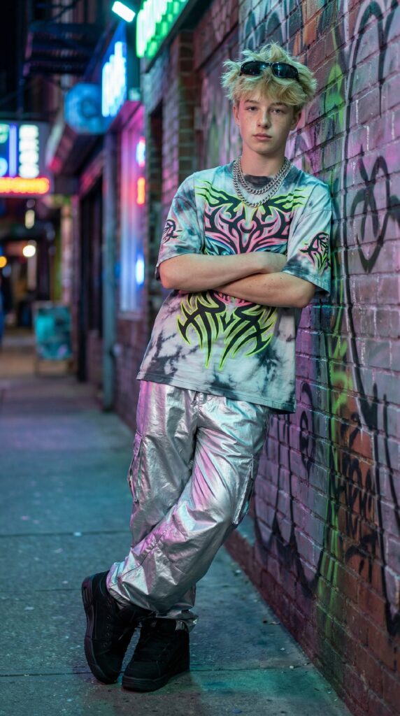 Пацанский шик прямиком из нулевых. Широкие штаны скрывают все секреты. Цепи блестят ярче твоего будущего. Идеально для дерзких уличных фотосессий.