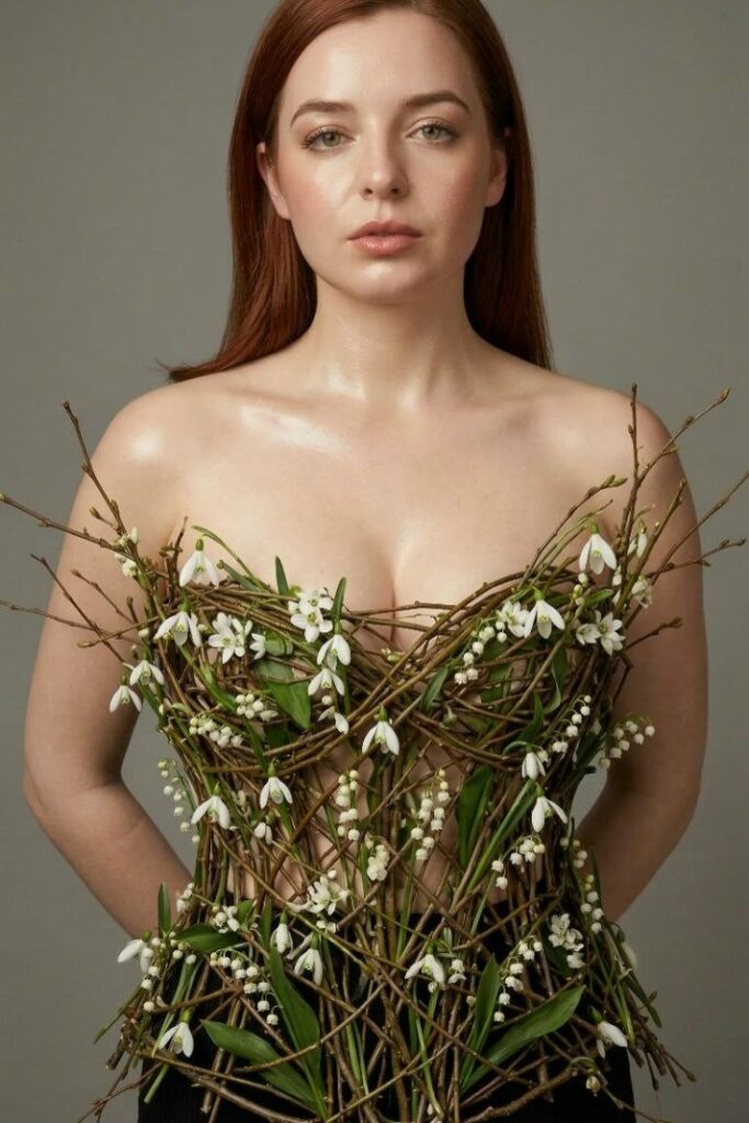 Секрет этого кадра — в абсолютном контрасте. Идеально гладкая, влажная кожа («glass skin») и колючие, жесткие переплетения веток с хрупкими подснежниками. Это сложная архитектура в кадре, которая заставляет зрителя зумить картинку, чтобы понять: как это вообще держится? Продавайте аудитории не просто весну, продавайте авангард и свежесть, которую можно ощутить физически.