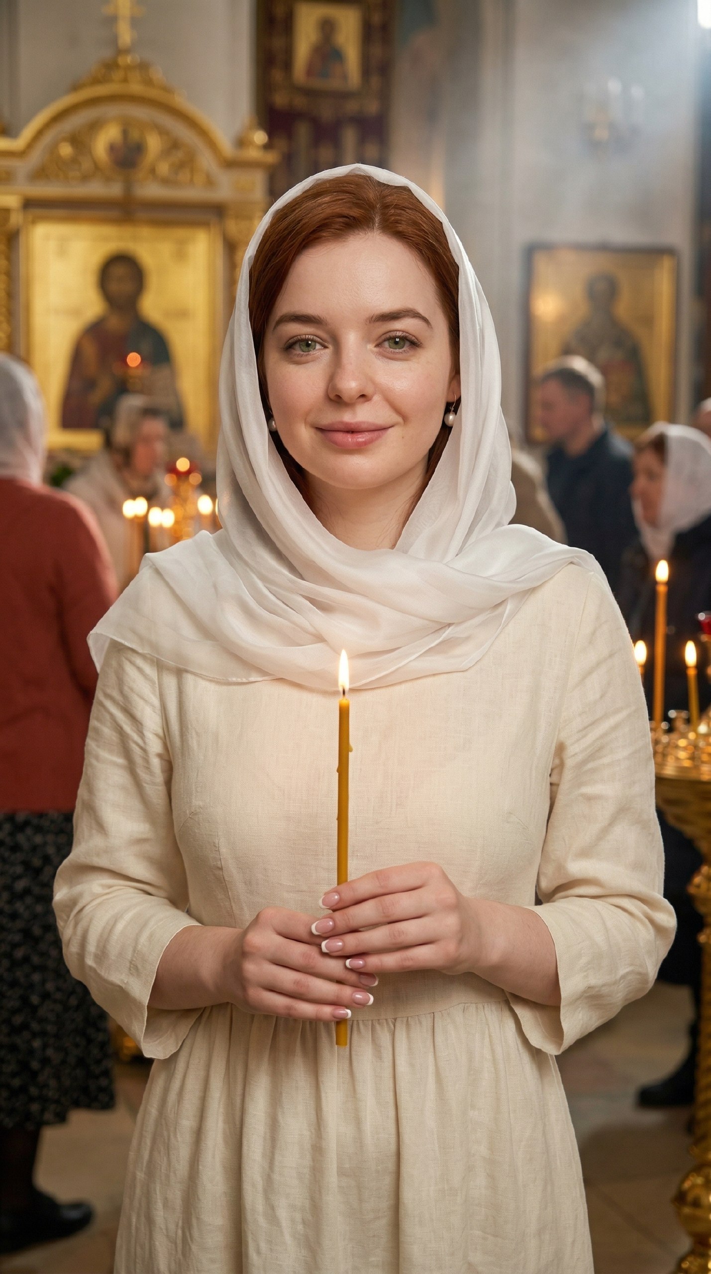 Нежный образ женщины излучает абсолютное спокойствие и внутренний свет. Тонкий белый шелковый платок мягко обрамляет ее утонченное лицо. Теплое свечение церковной свечи создает невероятно глубокую атмосферу таинства. Каждая деталь фактурной одежды подчеркивает чистоту и торжественность момента. Этот потрясающий кадр передает всю суть великого весеннего праздника.