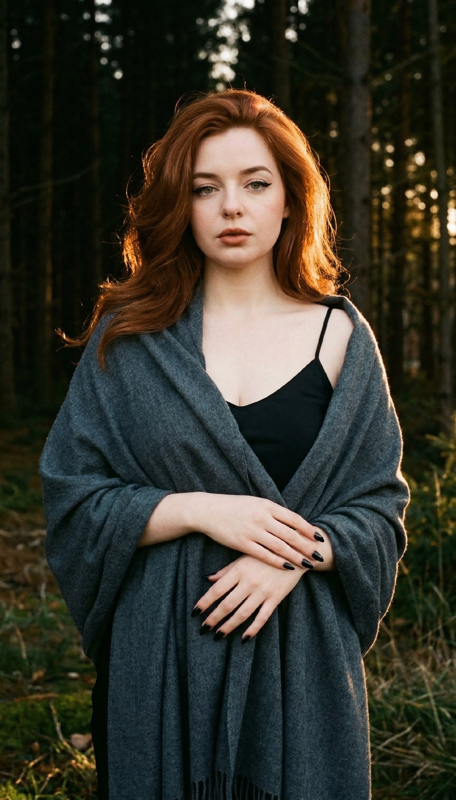 Ощутите глубокую и загадочную атмосферу вечернего хвойного леса 🌲. Объемный серый палантин, строгий черный топ и темный маникюр создают роскошный, слегка мистический образ. Золотистый контровой свет эффектно подсвечивает волосы на фоне темных деревьев, добавляя кадру настоящую кинематографичную драму. Хотите примерить этот элегантный и глубокий стиль? Забирайте промт и создавайте свой шедевр прямо сейчас ✨.
