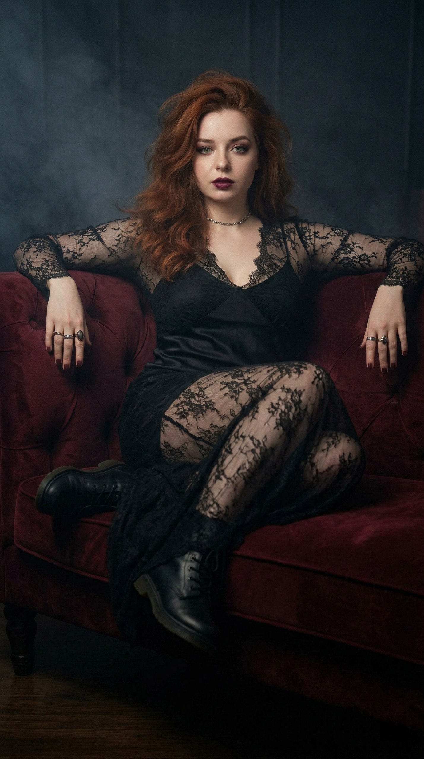A highly realistic moody cinematic portrait of a woman. Exact facial features matching reference. Hair color matching reference, messy voluminous blowout. Wearing a sheer black lace maxi dress over a black silk slip, combat boots. Siren eye makeup, dark berry lips. Matte burgundy manicure, black pedicure. Delicate silver choker, vintage rings. Posing dramatically lying on a luxurious burgundy velvet sofa with one leg draped over the edge. Accurate human anatomy, 5 fingers, flawless proportions. Moody volumetric lighting, smoke, 8k, photorealistic. —ar 9:16