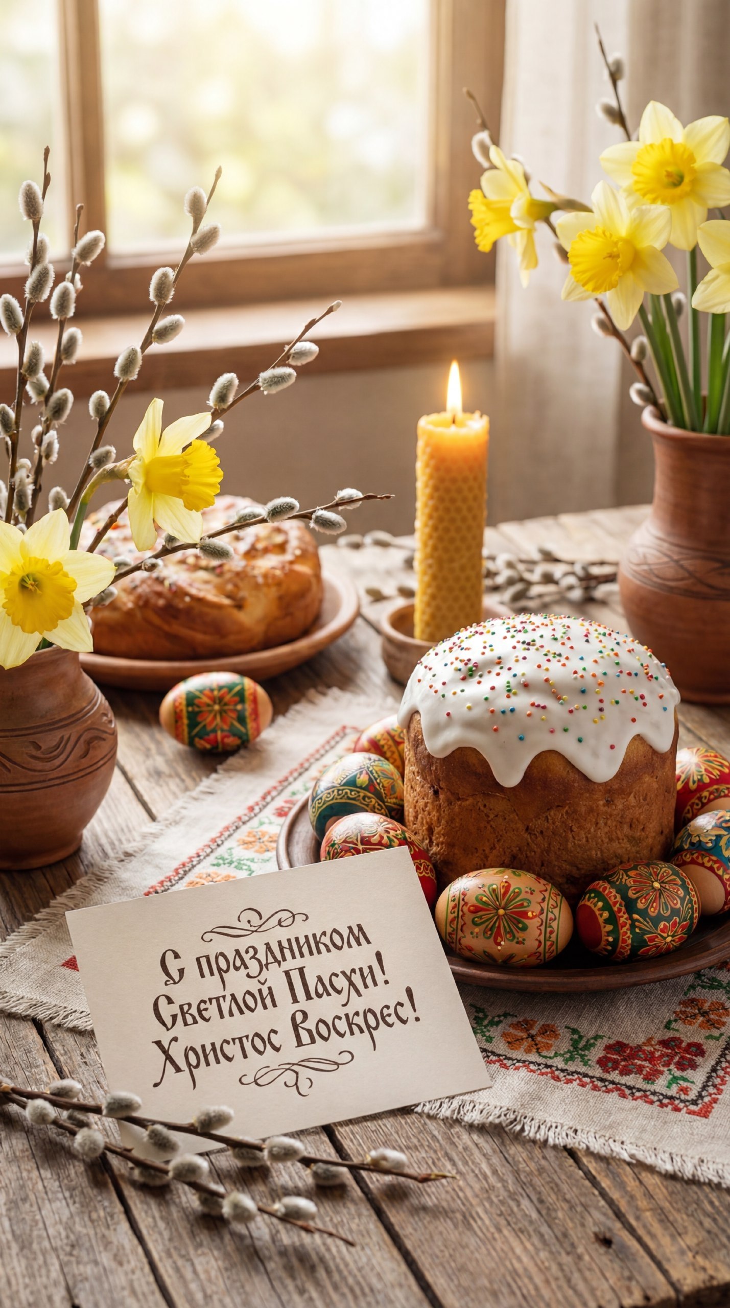 A close-up vertical shot of a rustic Easter setting. A large kulich with white glaze and colorful sprinkles is surrounded by hand-painted eggs with intricate folk patterns. A tall textured honeycomb beeswax candle burns brightly. Two clay vases with bright yellow daffodils and pussy willow branches. A linen napkin with traditional embroidery lies on a weathered wooden table. Rich textures, warm cozy atmosphere, macro photography, 8k. —ar 9:16