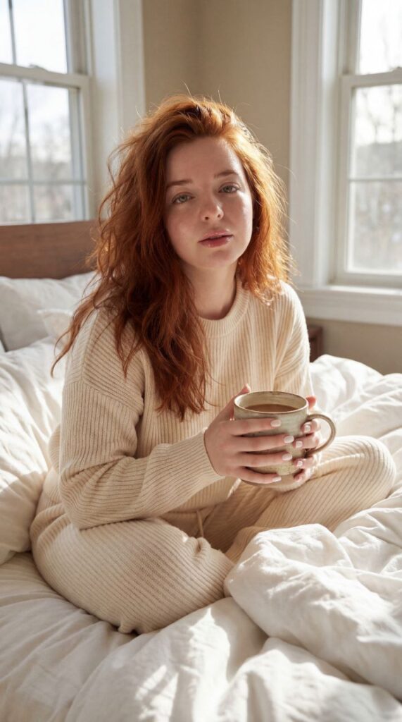 Этот кадр — энциклопедия того, как работает дорогой лайфстайл. Главный секрет здесь не в лице, а в многослойности фактур: грубая керамика кружки, объемный рубчик на трикотаже и небрежно смятый лен постельного белья. А контрольный выстрел — это контровой солнечный свет из окна, который создает объем. Мы не позируем, мы просто живем свою лучшую, ленивую жизнь.