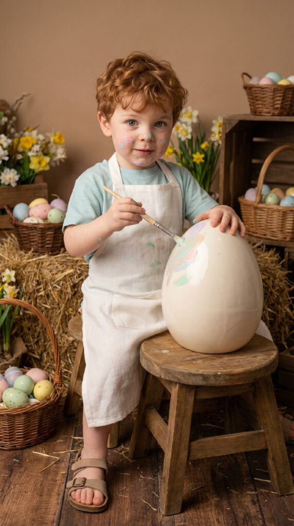 Легкая небрежность ценится больше идеального глянца. Испачканные краской щеки делают кадр невероятно живым. Льняной фартук добавляет крутой фактуры всему образу. Роспись гигантского яйца — это отличный визуальный сторителлинг. Тюки сена на фоне создают уютный рустик-вайб. Смотрится свежо, натурально и очень трендово.